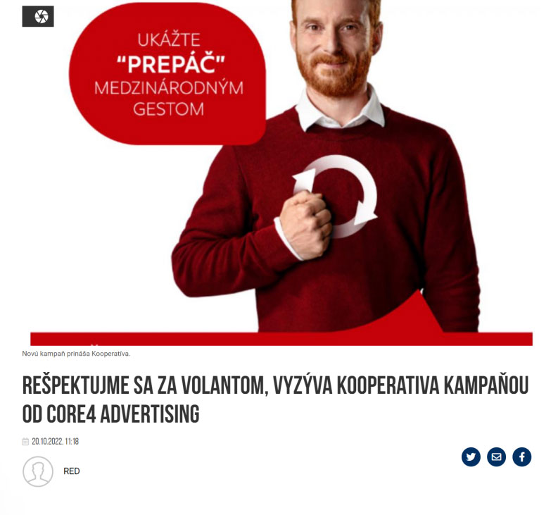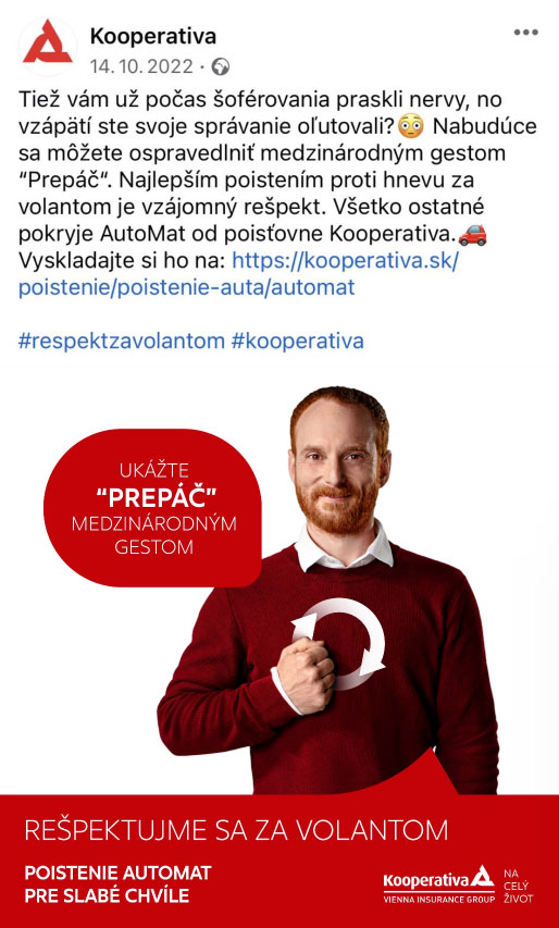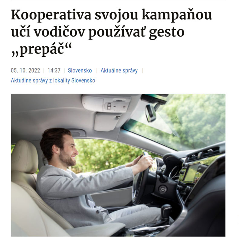 Nášho klienta sme presvedčili, že z tejto kampane dokážeme vyťažiť viac než len obyčajný hardsell. Vytvorili sme produktovú kampaň so silnými CSR a imidžovými prvkami. Message „rešpektuje všetkých vodičov“ sme pretavili do osvetovej kampane, v ktorej sme slovenských vodičov naučili ukázať si spoza volantu gestom „prepáč“.